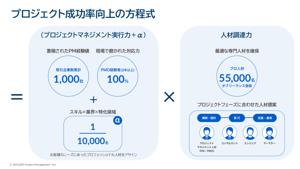 INTPMは、INTLOOP株式会社(以下「INTLOOP(よみ:イントループ)」)100%出資のグループ会社として、INTLOOPが有する人材ネットワークや支援基盤と連携しながら、プロジェクトマネジメント領域に特化した価値提供を担っています。たとえば、PM/PMOに限らず、プロジェクト推進に必要となる業務・技術領域の専門人材についても、状況に応じて確保・連携し、プロジェクト成功に必要な体制を構築します。