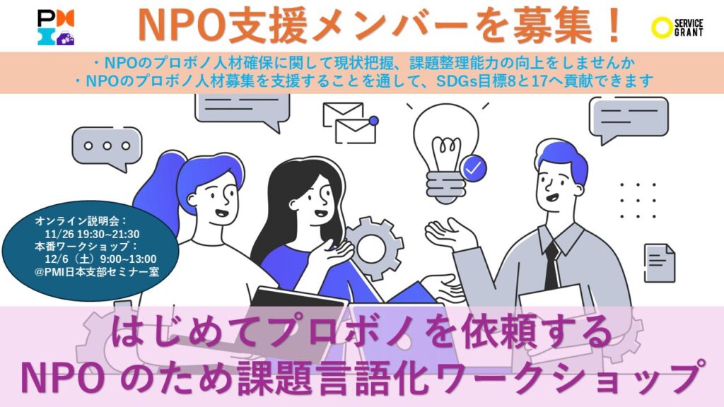 プロボノ(専門家による専門性のあるボランティア)の力を借りたいが、ボランティア募集要項を適切に記載できない、つまり初めての経験であり言語化の仕方が分からないNPO(社会課題解決を行う非営利団体)に対し、スコープ定義や要件定義の専門家であるPMI日本支部ボランティアがプロボノ募集の要件を言語化支援するワークショップを行います。