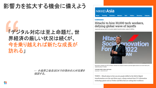 In the end, what is exciting for project managers is that digital transformation is an exceptional opportunity to have great impact. I’m sure that all of you saw this headline at the end of last year. Hitachi is hiring 30,000 people to drive transformations over the next three years. And that’s… Just one example, but it really should make you feel very marketable as a product professional, very much in demand, especially if you have a PMP. Note that President Kojima feels that new growth will arrive when he says, quote unquote, we, that is Japan, overcome the current situation. So the best way to do this is to digitally transform existing businesses, something you are uniquely positioned to do. I look at this not just as additional career opportunities for project managers. That’s already important of course, but it’s also a way to do something meaningful. Together we can not only help Japan regain its leadership position, but we can get the entire world to improve, to be on a better economic footing, and make society more people-centric and more sustainable. Yet project managers need to be equipped to support business leaders on their path to digital transformation.