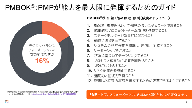 The success rates, as you see on the chart here, are not very high. Our role though in this challenge is clear. PMPs, all of you, are perfectly positioned to make these numbers better. Some of you may have not opened a PMBOK guide for years. I do recommend though that you take a look at PMBOK 7 because… It covers very important principles. I mentioned some of them earlier. These principles transcend any methodology, whether you use agile, predictive, lean, DevOps, Kanban, et cetera, it doesn’t matter. They are all principles that are designed to help you shape your approach and support your success. Now, to name a few of them, the first principle says be a diligent, respectful, and caring steward. Following this principle will quickly increase your influence. It is one major key to your success. Project managers are encouraged to be good project stewards. With digital transformations, technology is ever-changing, so the program may need to shift gears dramatically to achieve the original intent. A caring steward will make the right decision at these inflection points. They will also responsibly manage and safeguard the organization’s digital assets, data, and technologies. They will ensure their integrity, privacy, and compliance with regulations and industry standards. Now the second principle is create a collaborative project team environment. So in summary, it’s not about me, it’s about we. When we collaborate with our project team, we work together to achieve the project’s objectives. Digital transformation requires cross-functional collaboration, knowledge sharing, and iterative problem solving that enables effective alignment and integration of digital technologies and processes across different departments and teams. Now, the third one, effectively engage with stakeholders, is about understanding that everyone needs to know what’s in it for me. Digital transformation requires actively involving stakeholders from different levels and functions. In the planning. decision making and implementation processes, so as to ensure their input, support and commitment to the digital transformation journey. So I could continue like this for each of the 12 principles, but I think you got my point. Again, I encourage each of you to read the PMBOK7 and to reflect on it, unless you’re already doing this every day. But reflecting on it based on your experience, it’s what is the most important thing. The role and expectations from project managers changed over the past decades. PMBOK is continuously being updated based on research conducted to understand how to make project professionals successful, how to increase the value delivered by projects, and ultimately how to create bigger impact, whether we talk about business, outcomes, or society.