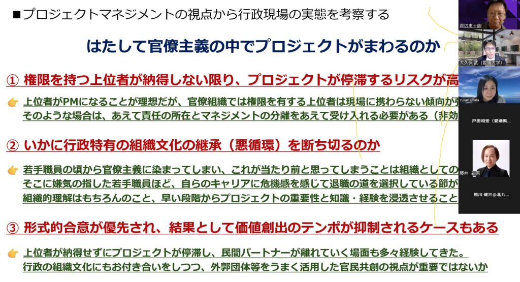 行政職員として数多くの事業推進に携わってきたご経験をもとに、行政特有の制約や組織文化、多様な関係者との連携の工夫について、プロジェクトマネジメントの視点から分かりやすくお話しいただきました。