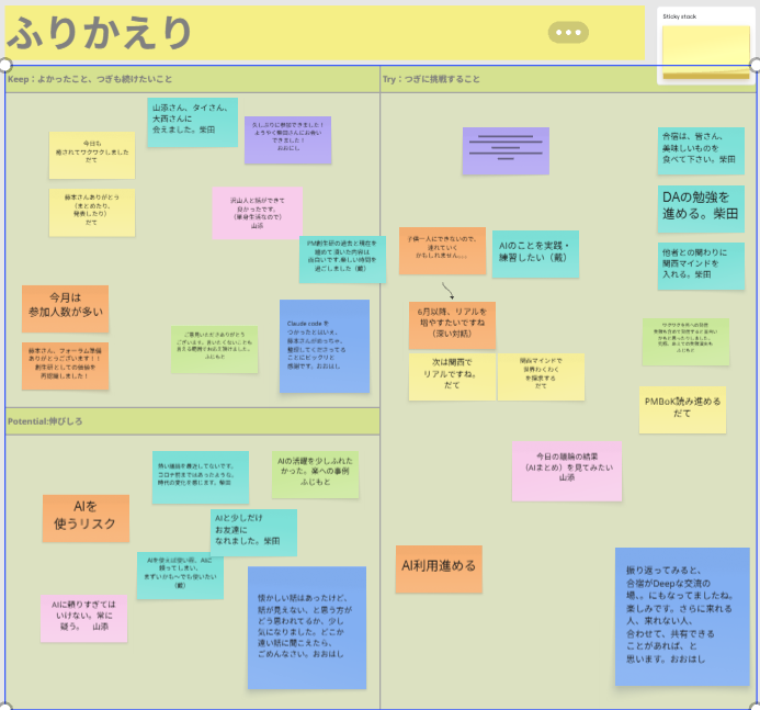 過去は、目標を定めそこに向かって発表を進めるも、発表をするために、研究会に入っているわけではない、などの揺れ動きがあり、創生研の存在価値を改めて探求し、自律的組織運営を進めていくあゆみなど、その当時の変遷に触れて、非常に参考になりました。AIの力はすごいと思いながらも、その背性AIに振り回されている感覚もあり、AIとの向き合い方が、今後の焦点になりそうです。