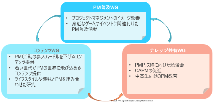 「はじめてのPM研」では、現在3つのワーキンググループ(WG)に分かれて活動しており、それぞれのグループが連携しながら、PMの理解を深め、学びやすく、成長しやすい場づくりを目指しています。